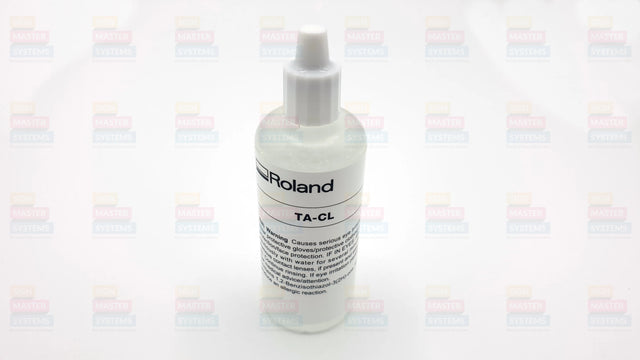 A cleaning liquid for use on Roland printers usings TA Resin inks. The liquid comes in a 100ml bottle and is used to clean and flush pad the ink delivery system.